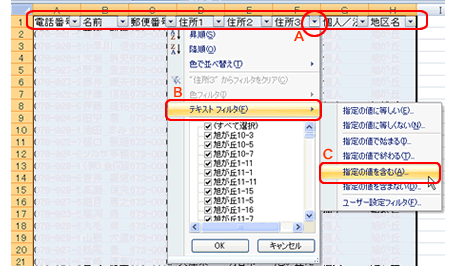 住所3の▼ボタンをクリックし(A)、[テキストフィルタ]をポイントし(B)、