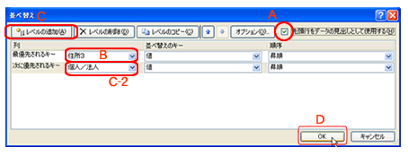 (C)[レベルの追加]ボタンをクリックし、「次に優先されるキー」に[個人/法人]と設定(C-2)します。