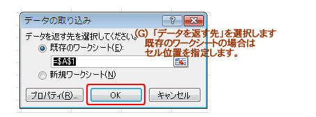 「データの取り込み」ダイアログボックスが表示されたら、データを返す先を指定します。
