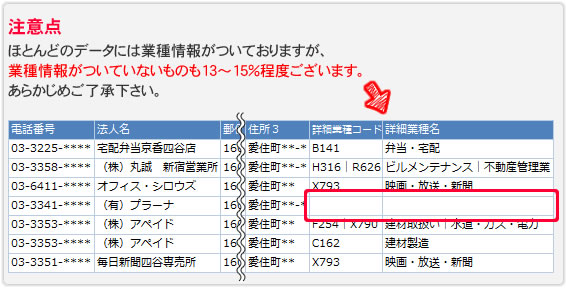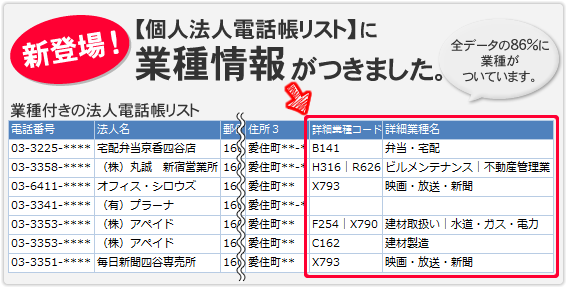 業種付きの法人リストは、従来の法人電話帳データに、業種情報を付加したリストになります。 各法人がどのような業種であるかが手に取るようにわかります。