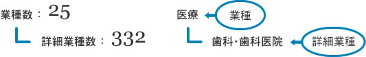 弊社の業種分類は、使いやすさや分かりやすさを重視した 独自の業種分類法を採用しております。 大まかな分類である「業種」と、それをさらに細かく分類した「詳細業種」で構成されております。