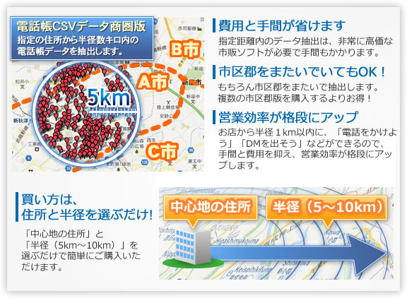 「電話帳CSVデータ商圏版」とは、あなたの会社やお店を中心に半径数キロ内にある電話帳データを抽出し提供するサービスです。